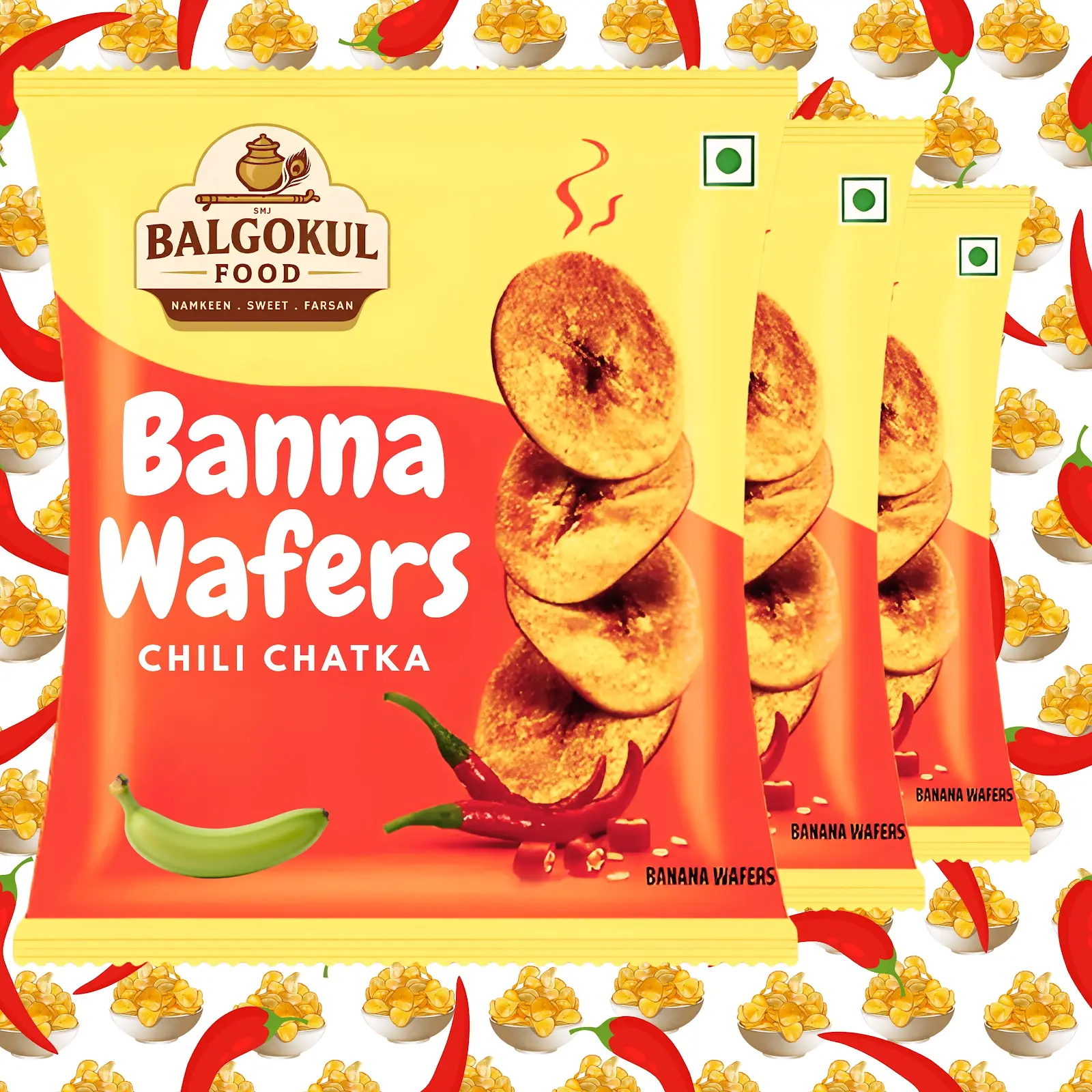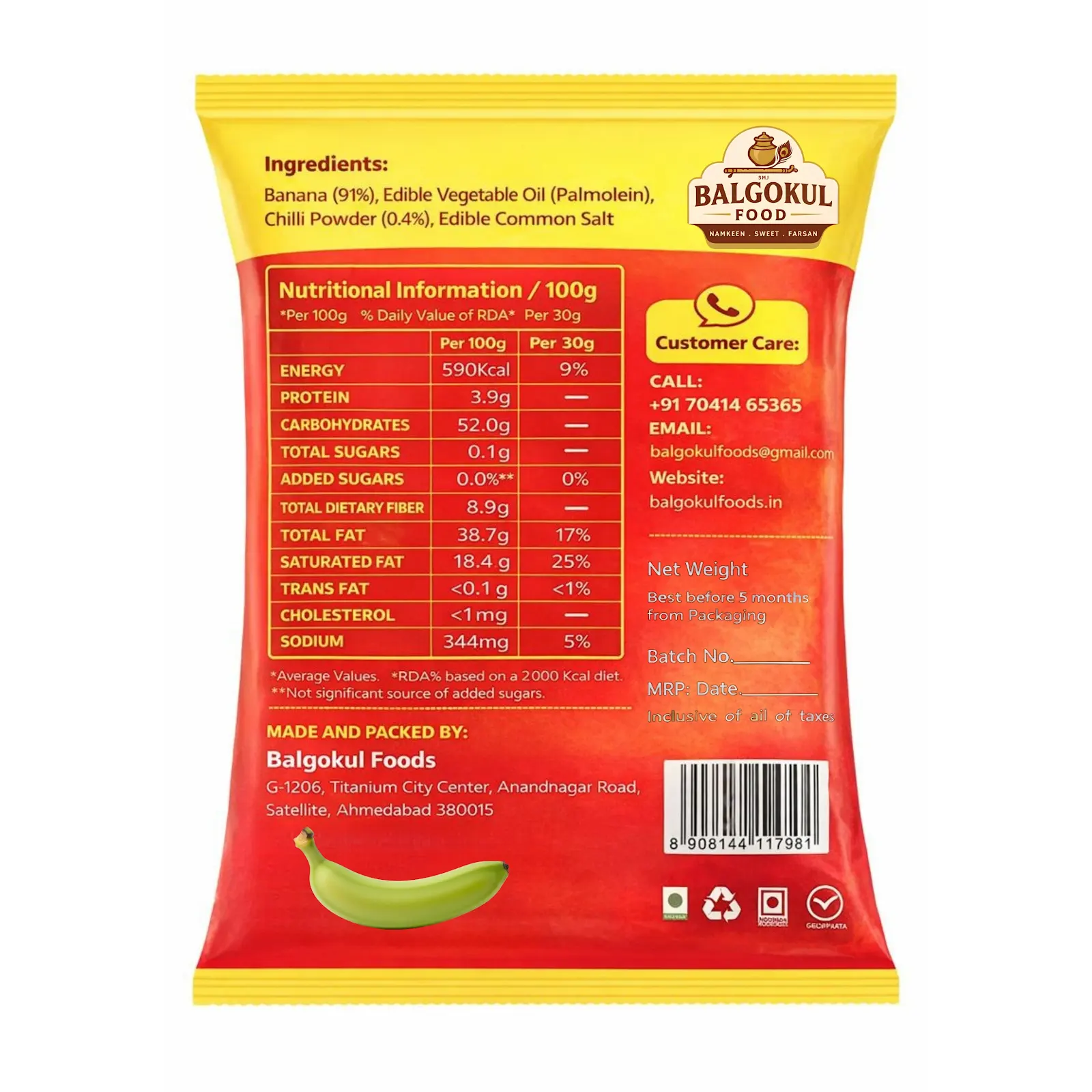 Turn up the heat with BalGokul Foods Banana Wafers – Chili Chatka. Made from premium raw bananas, thinly sliced and perfectly fried, these wafers are seasoned with spicy chilli powder to give a bold, desi kick.