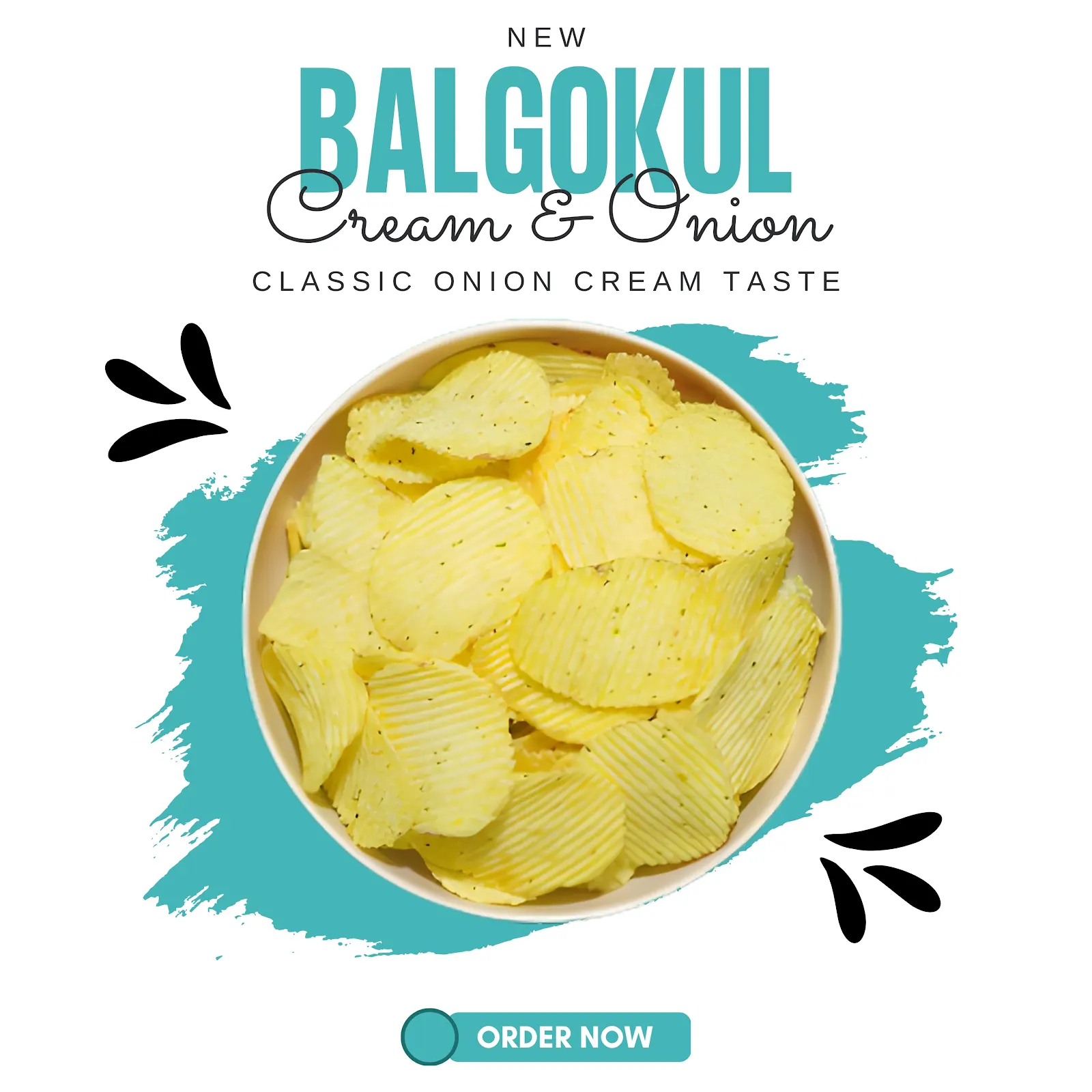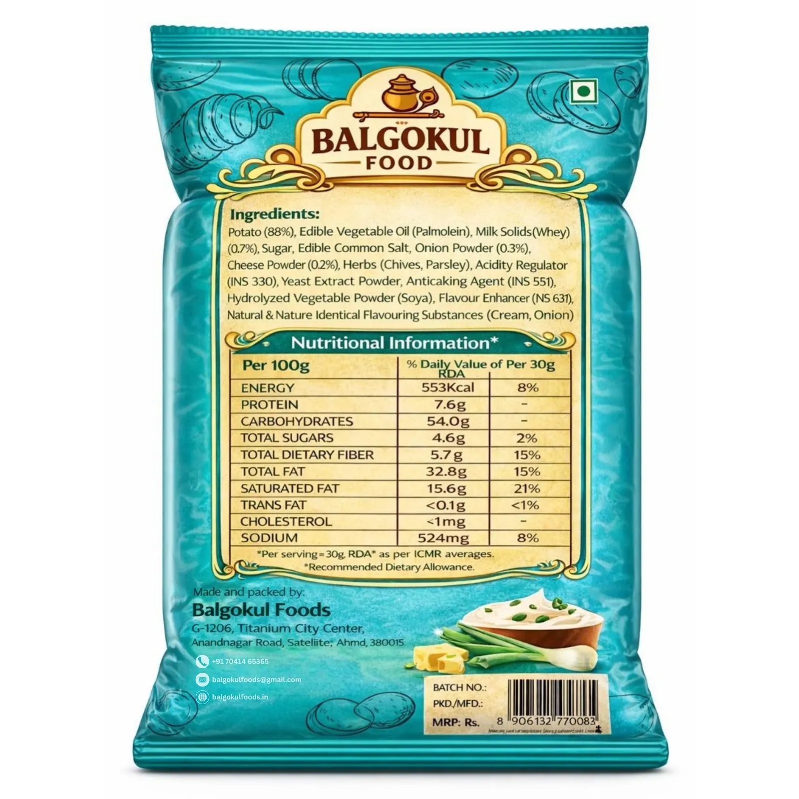 Experience the authentic taste of tradition with BalGokul Foods Cream & Onion Wafer. Made from carefully selected potatoes and seasoned with a rich blend of cream and onion flavour, these wafers offer a perfectly balanced taste with a light, crispy crunch in every bite.