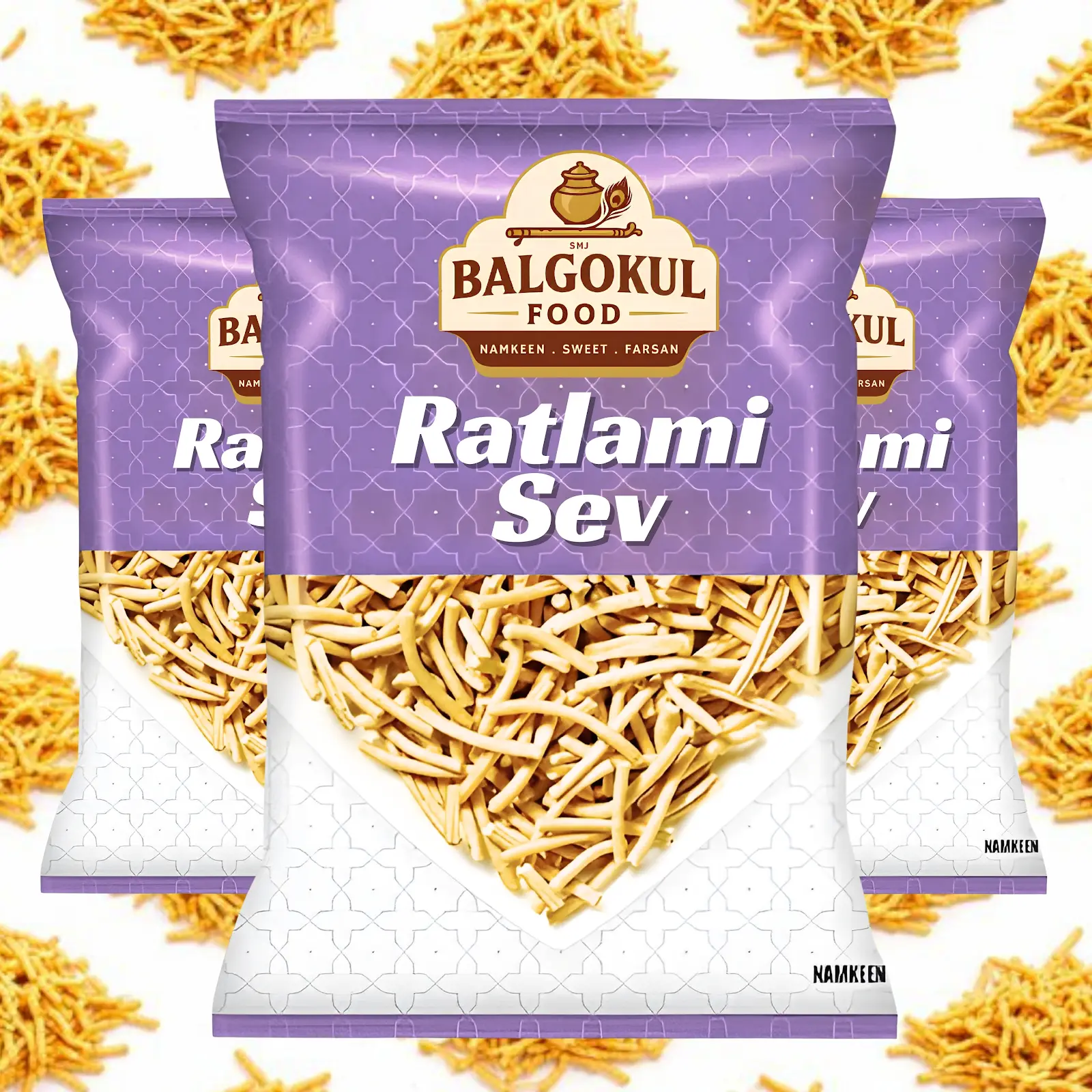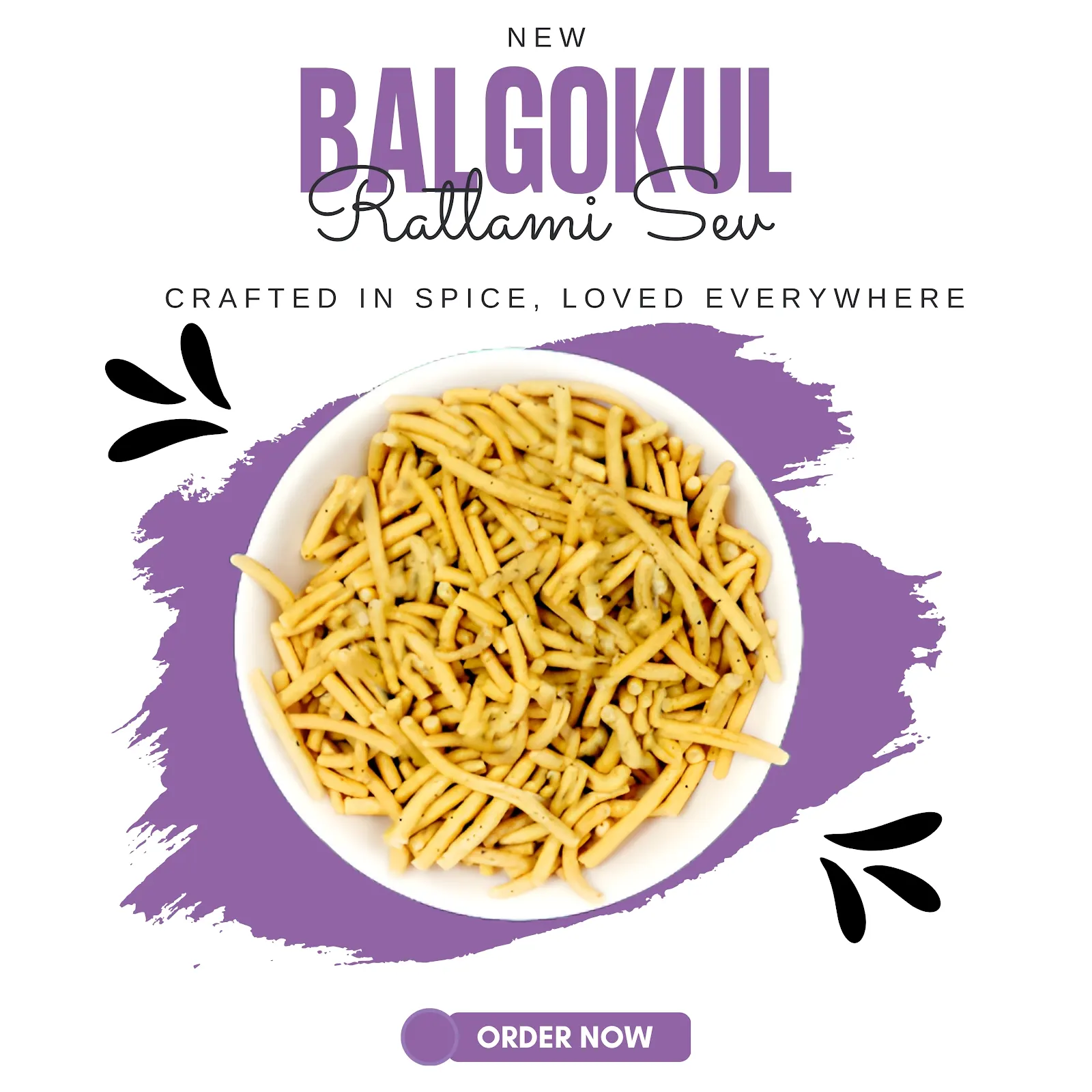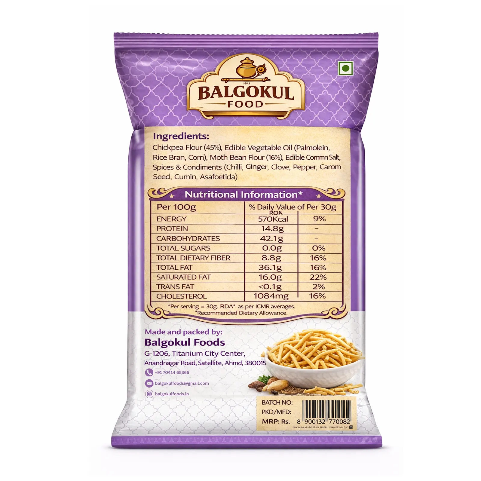 Experience the bold, authentic taste of Central India with BalGokul Foods Ratlami Sev. Made using chickpea flour and moth bean flour, and infused with a robust blend of traditional spices, this sev delivers a strong aroma, spicy punch, and irresistible crunch.